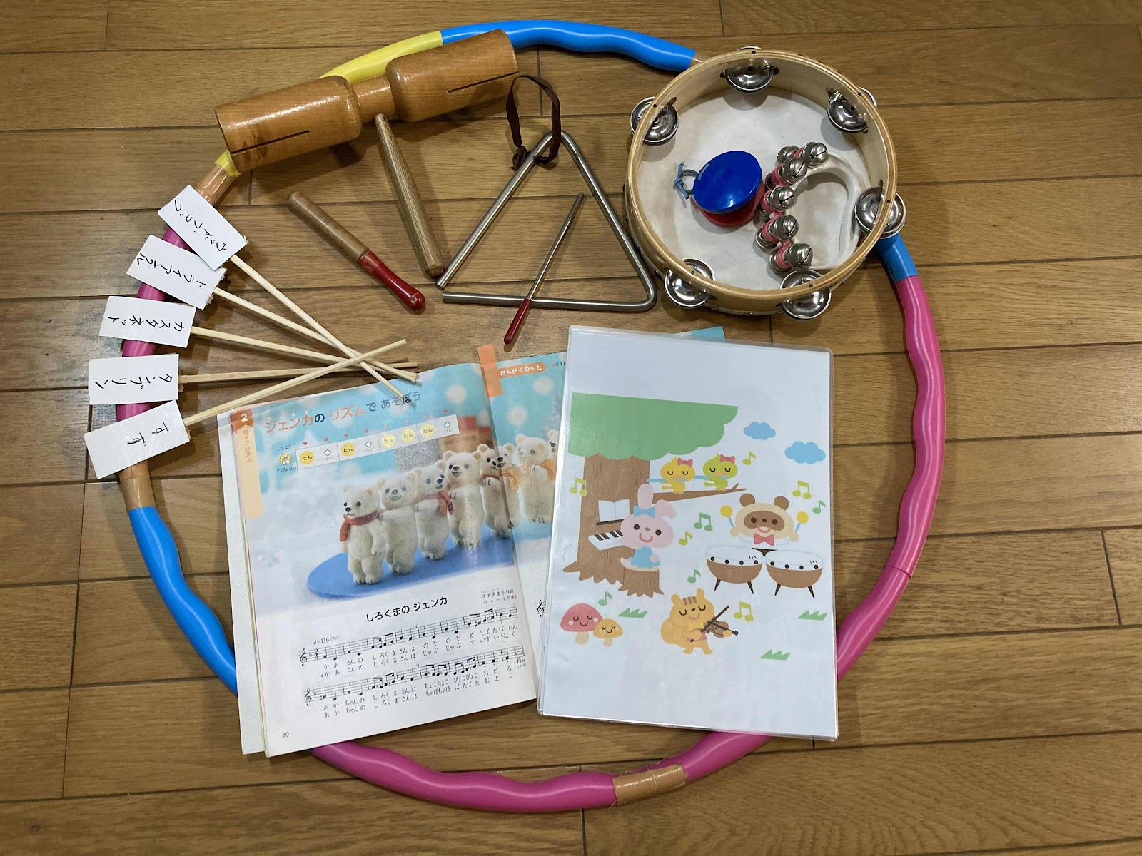 やまの音楽家の曲に合わせて楽器演奏をしました。楽器選びがスムーズにいくように楽器の名前を書いた札をつくりました。